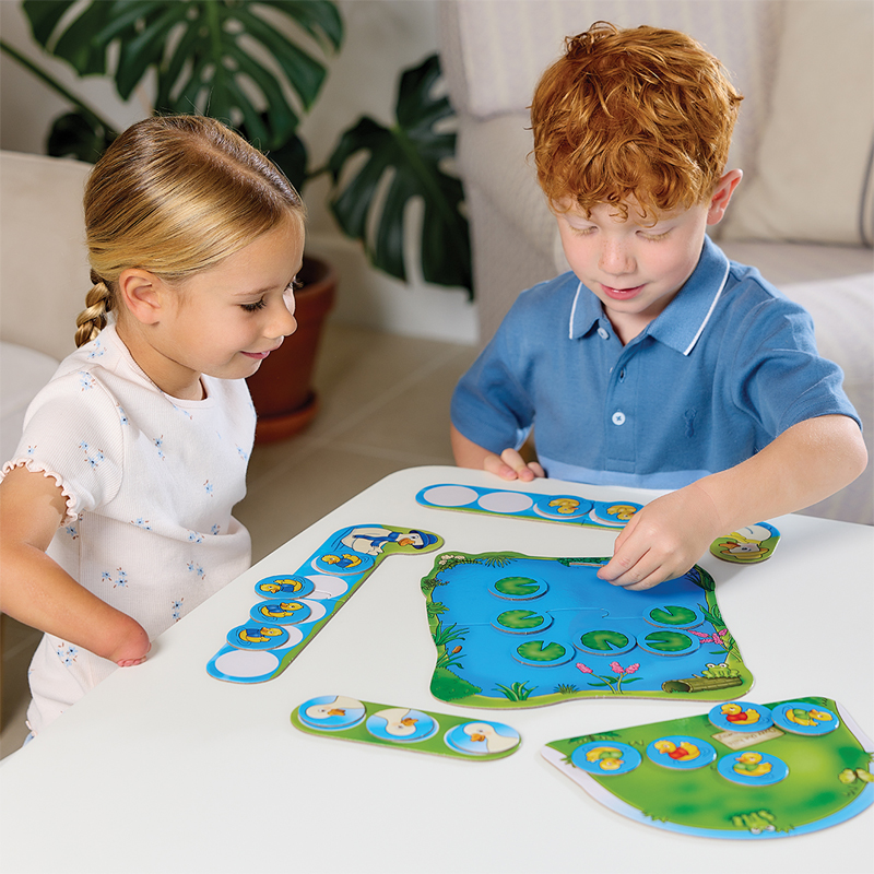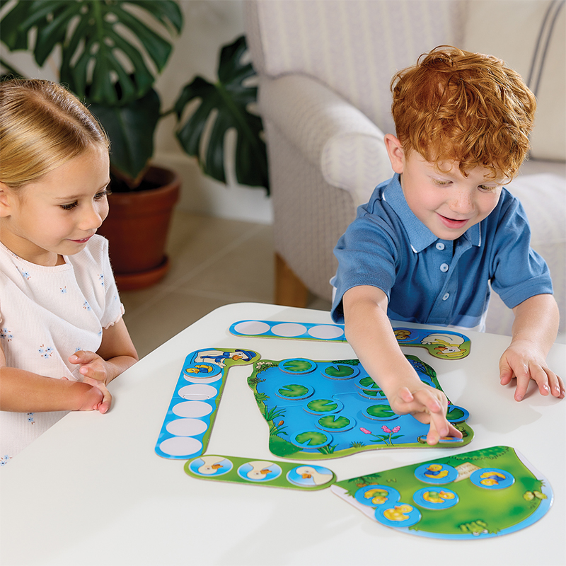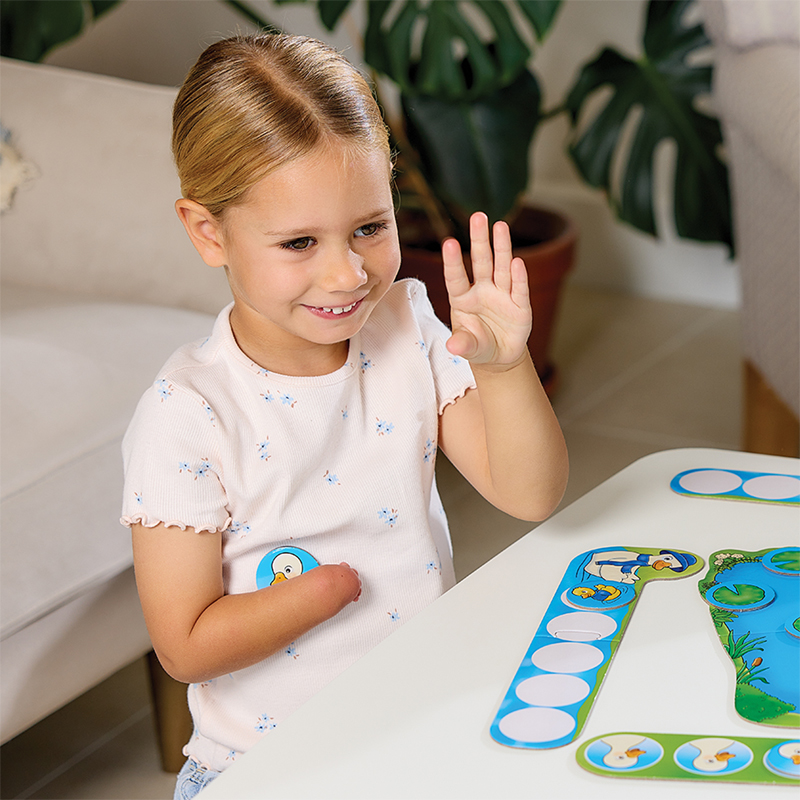 Be the first to collect all five of your coloured ducklings and call them home! Players take turns turning over lily pad cards from the pond board. If it’s a duckling, place it on the hill, but if it’s a mother duck, call your ducklings back by saying “quacl, quack, quack, quack”! The first player to collect all their ducklings wins!
