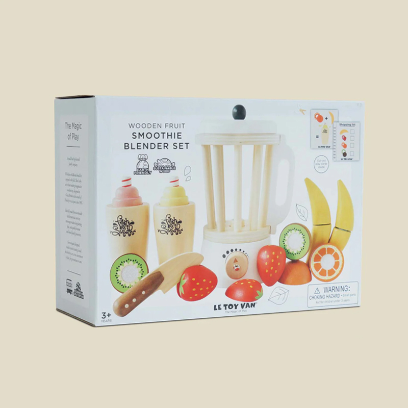 Featuring a retro style blender with a detachable jug, 6 sliceable fruits, a play knife and 2 wooden tumblers with removable toppings.