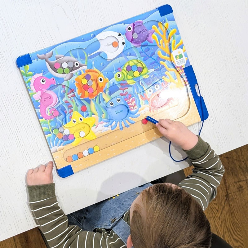Little ones will love to explore this under the water sea maze, as they sort the coloured pieces into the corresponding location. This fun and colourful hands-on sea life magnetic tray puzzle helps children to learn their colours in a fun and engaging way.